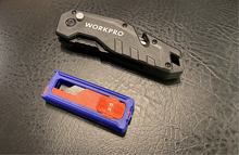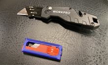 Good comfortable knife, plastic handle and a dozen spare blades, excellent