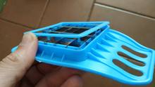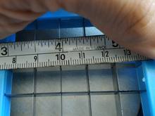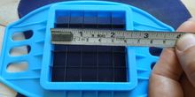 Product matches the description. Blades are held in place by a plastic fitting, but they pop out easily, needs carefull usage. 60mm side size, with 12mm blade spacing.